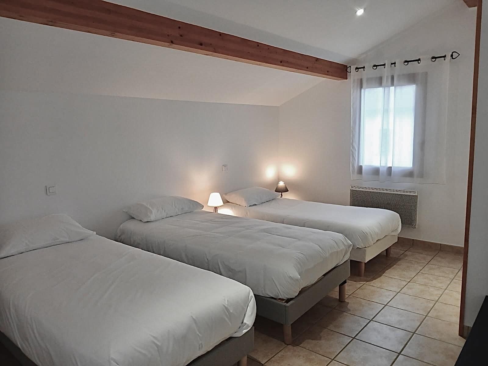 It features a bedroom for two on the ground floor and a room with three single beds upstairs, along with 2 toilets, a shower room, and a fully equipped kitchen.