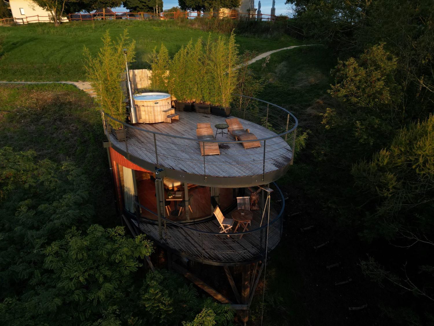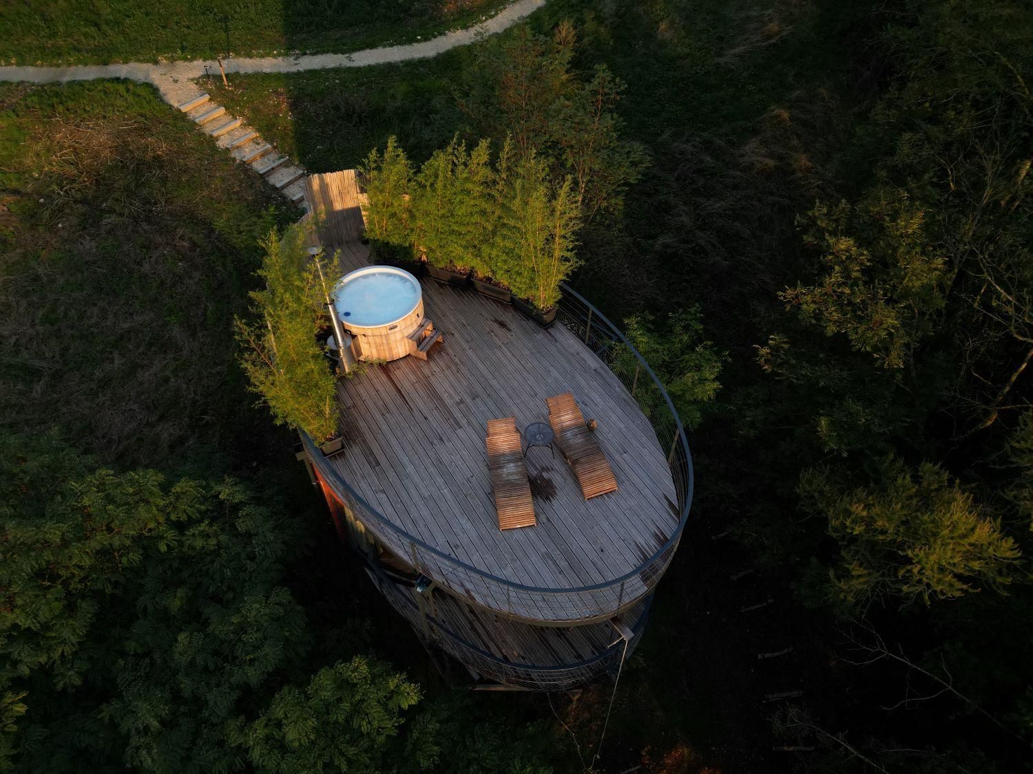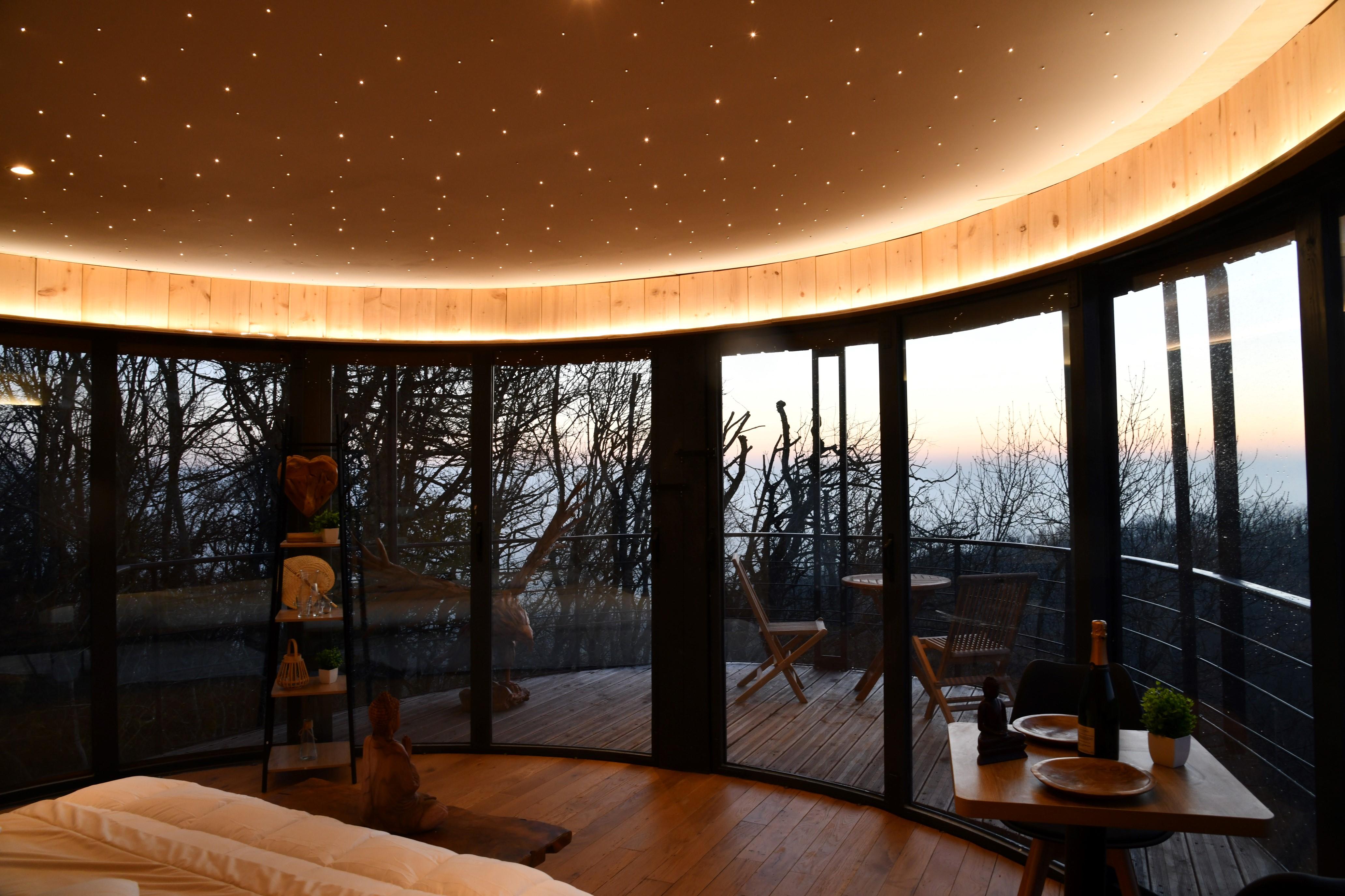 This unique lodge features a large circular glass window that opens onto a terrace 6 meters above ground, allowing you to fully enjoy the surroundings and let in abundant natural light. You can also relax on the 37-square-meter rooftop terrace, complete with a spa and views of the Isère landscapes and sunsets.